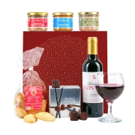 Delight your senses with our exquisite Elegant Delights Gift Hamper, curated to offer a luxurious gourmet experience. Begin your journey with a bottle of Bordeaux Red Marquis des Lèves - AOP Wine, a rich and refined red that pairs perfectly with the included delicacies. Savor the quail delight infused with Muscat de Beaumes de Venise, a decadent spread with hints of French sophistication. The boletus and porcini mushroom spread, accented with Madagascar pepper, adds a rustic charm, while the country terrine with South-West pepper brings traditional flavors to life. Complement these with a sweet touch: mini chocolate chip orange cookies and a navy case of natural fancy truffles. Presented in a charming gift box adorned with a cherry decoration, this hamper is the epitome of taste and elegance.