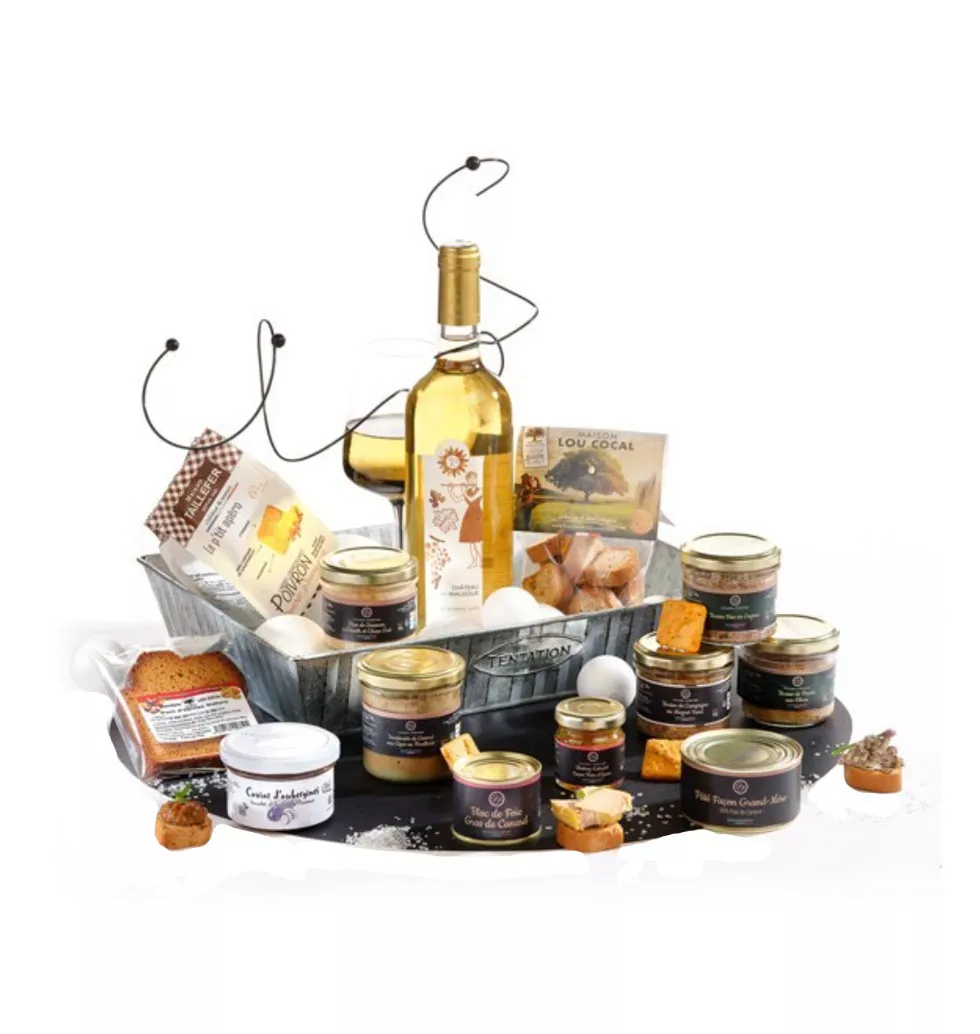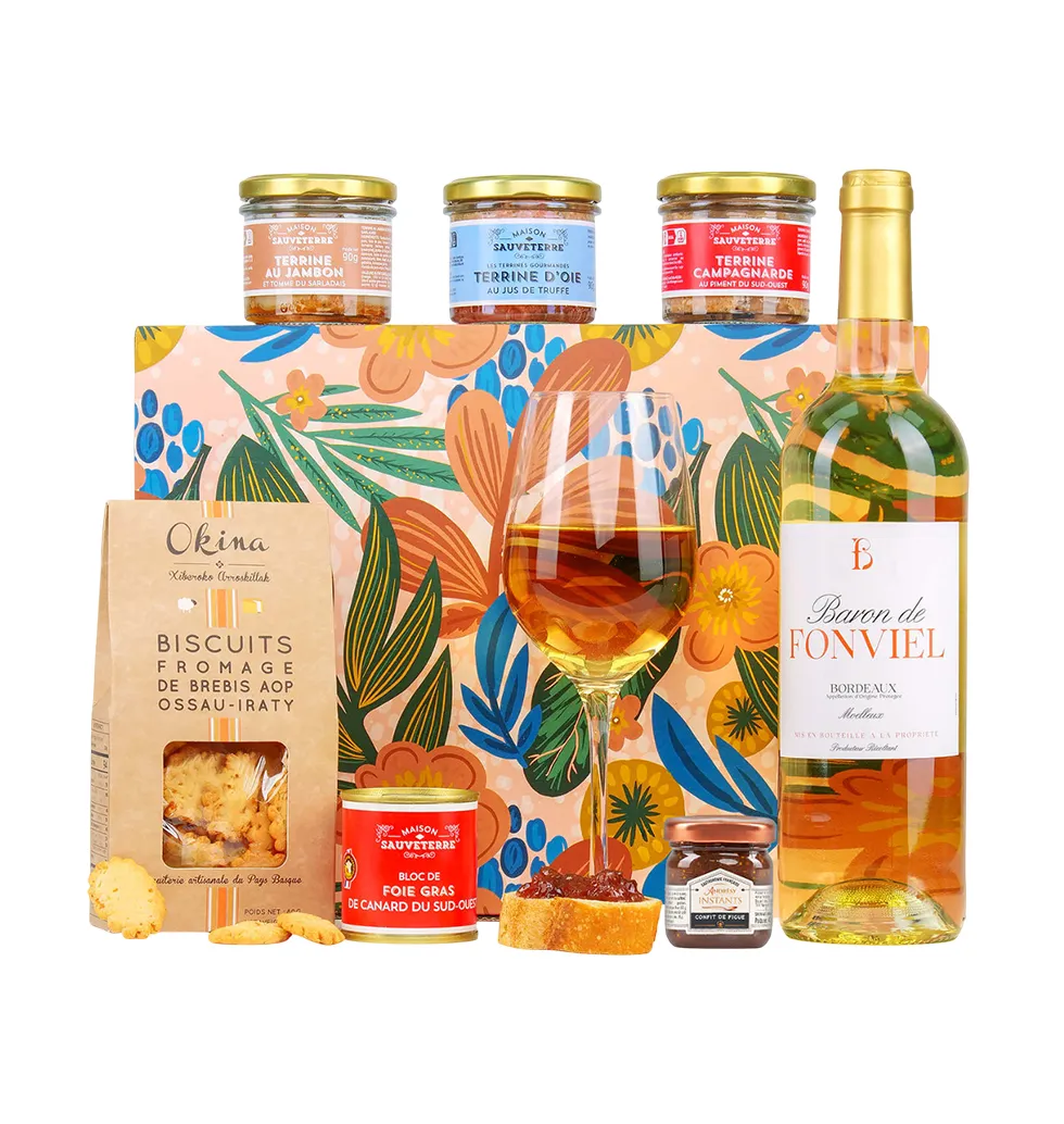This Elegant Gift Box of Delicious Treats is a real winner! The sweet white wine from Bordeaux is simply divine and pairs perfectly with the savory terrines. And let's not forget the block of duck foie gras – it's a taste sensation that will leave you wanting more!